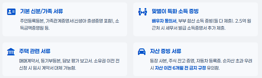 소득 조건: 부부 합산 연소득 2.5억 원 이하(맞벌이 시 각자 1.3억 원 초과 금지). 2025년 완화로 이전 2억 원에서 상향됐지만, 세금 신고 기준 총소득을 정확히 계산하세요. 사업소득자는 사업자등록증, 근로소득자는 건강보험 자격득실확인서가 필요해요.