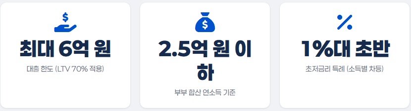 이 조건을 충족하면 한도 6억 원(주택 가격 × LTV 70% 중 작은 금액)으로 신청 가능해요. 만약 초과 시 대환 대출로 전환하는 옵션도 고려해보세요.