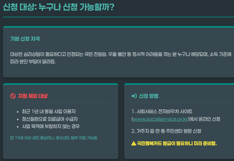 대상은 심리상담이 필요하다고 인정되는 국민 전원입니다. 우울·불안 등 정서적 어려움을 겪는 분이라면 누구나 해당되며, 소득 기준에 따라 본인 부담이 달라져요.