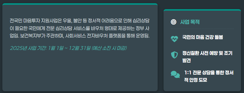 목적은 국민의 마음 건강을 돌보고, 정신질환을 사전 예방·조기 발견하는 데 있어요. 대화 기반의 1:1 전문 상담을 통해 정서적 안정을 도모하죠. 2025년에는 사업 기간이 1월 1일부터 12월 31일까지로, 예산 소진 시 마감될 수 있으니 서둘러 신청하세요.
