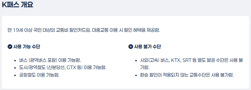 K패스는 19세 이상 국민이라면 누구나 사용할 수 있는 교통비 할인카드입니다. 대중교통 이용 시 할인 혜택을 제공하며, 버스(광역버스 포함), 도시/광역철도(신분당선, GTX 등), 공항철도 등에서 사용 가능합니다. 다만, 시외(고속) 버스, KTX, SRT, 공항버스 등 별도 발권이 필요하거나 환승 할인이 적용되지 않는 교통수단에는 사용할 수 없으니 이 점 유의해 주세요.