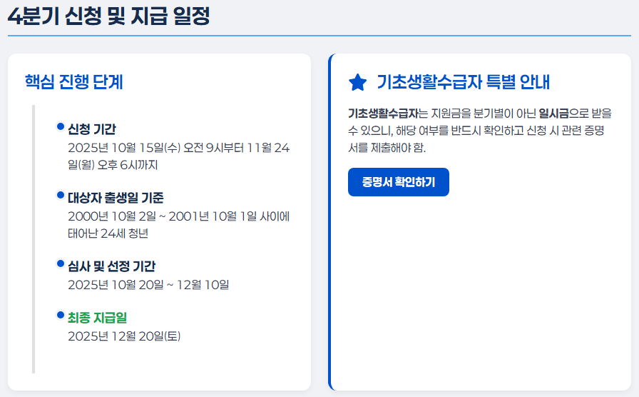2025년 4분기 청년기본소득 신청 일정과 지급 일정은 다음과 같습니다: