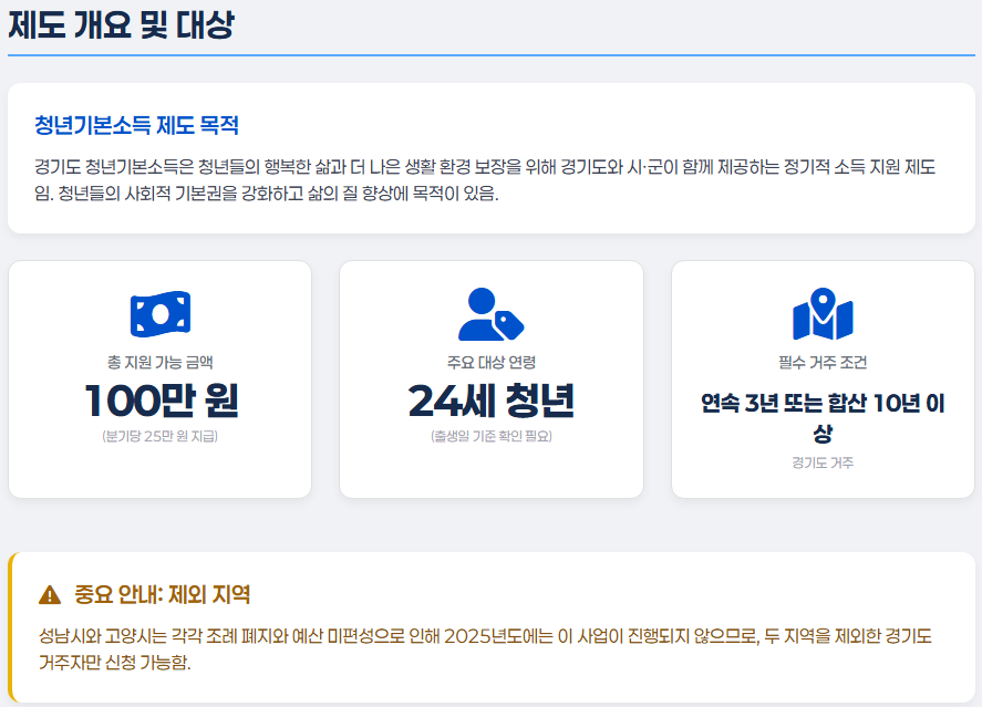 지원 대상은 경기도에 3년 이상 연속 거주했거나 합산 10년 이상 거주한 24세 청년입니다. 분기당 25만 원, 최대 4분기 총 100만 원이 모바일 또는 카드 형태의 경기지역화폐로 지급됩니다. 단, 성남시와 고양시는 각각 조례 폐지와 예산 미편성으로 인해 2025년도에는 이 사업이 진행되지 않으니, 두 지역을 제외한 경기도 거주자라면 누구나 신청 가능합니다!