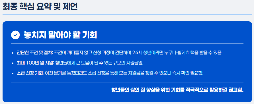 경기도 청년기본소득은 조건이 까다롭지 않고 신청 과정도 간단해 24세라면 누구나 쉽게 혜택을 받을 수 있습니다. 최대 100만 원이라는 지원금은 청년들에게 큰 도움이 될 수 있죠. 게다가 소급 신청으로 놓친 분기의 지원금도 챙길 수 있으니, 지금 바로 신청해 보세요! 이 기회를 놓치지 말고 꼭 챙기시길 바랍니다!