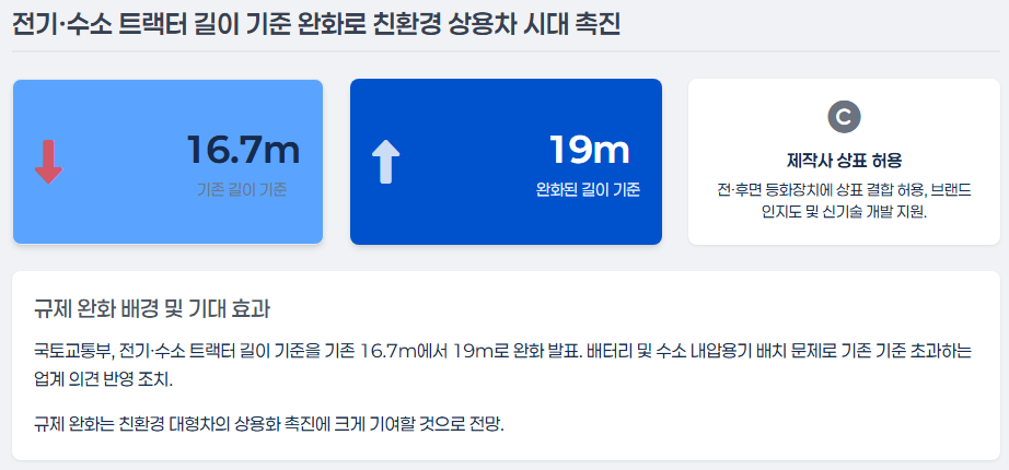 대형 차량에서도 변화의 바람이 불고 있습니다. 국토교통부는 전기나 수소를 동력으로 사용하는 트랙터의 길이 기준을 기존 16.7m에서 19m로 완화한다고 발표했습니다. 이는 배터리나 수소 내압용기의 배치 문제로 인해 기존 기준을 초과하는 경우가 많다는 업계 의견을 반영한 조치입니다.