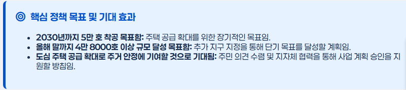 이 사업은 도심 내에서 주택 공급을 늘리기 위해 공공이 주도하는 프로젝트예요. 민간에서 정비가 어려운 노후 지역을 대상으로 용적률 완화 등의 혜택을 주고, 신속하게 주택을 공급하는 방식이죠. 주민들의 선호도가 높은 도심 입지를 활용해 쾌적한 주거 공간을 만드는 게 핵심입니다.