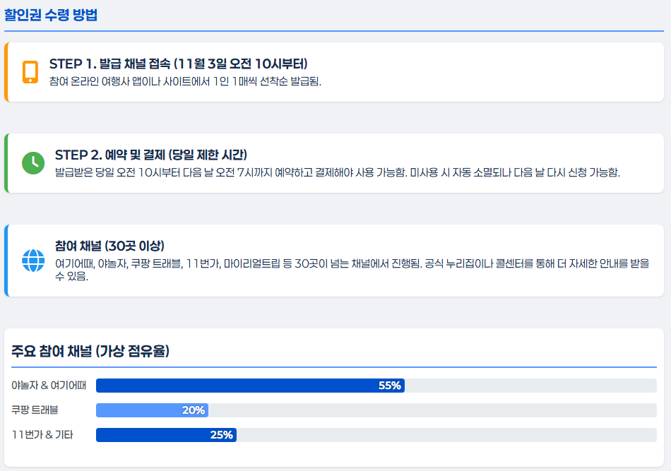 할인권은 11월 3일 오전 10시부터 참여하는 온라인 여행사 앱이나 사이트에서 1인 1매씩 선착순 발급돼요. 발급받은 당일 오전 10시부터 다음 날 오전 7시까지 예약하고 결제해야 사용 가능하고, 안 쓰면 자동으로 사라져요. 하지만 다음 날 다시 신청할 수 있으니 부담 없이 도전해보세요.
