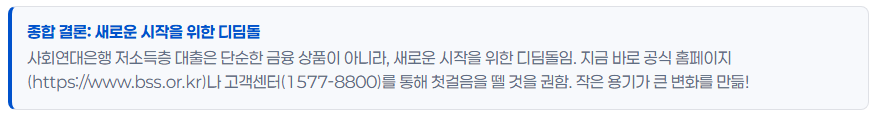 사회연대은행 저소득층 대출은 단순한 금융 상품이 아니라, 새로운 시작을 위한 디딤돌입니다. 지금 바로 사회연대은행 공식 홈페이지(https://www.bss.or.kr)나 고객센터: 1577-8800 (평일 9~18시)를 통해 첫걸음을 떼어보세요. 작은 용기가 큰 변화를 만듭니다!