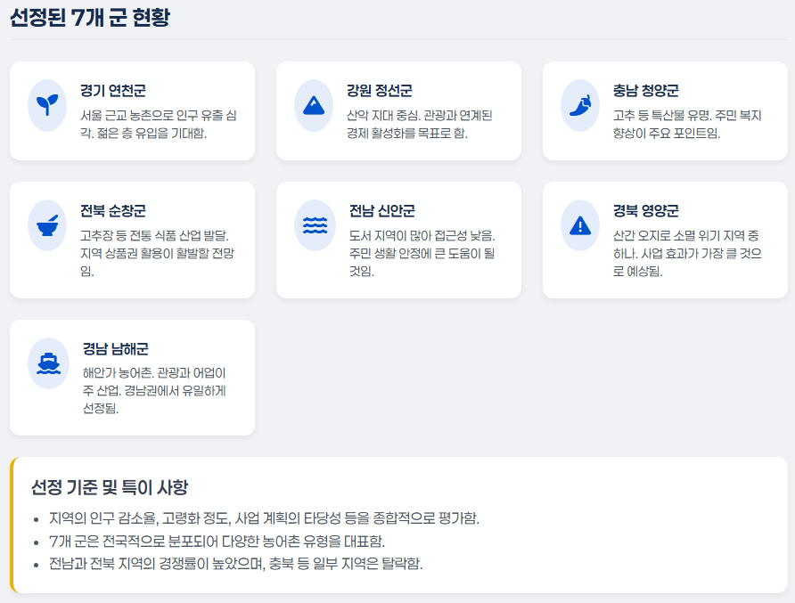 2025년 10월 20일, 농림축산식품부는 공모 결과를 발표하며 다음 7개 군을 시범지역으로 최종 선정했습니다. 선정 기준은 지역의 인구 감소율, 고령화 정도, 사업 계획의 타당성 등을 종합적으로 평가한 결과입니다. 각 군은 행정 표기순으로 나열하겠습니다: