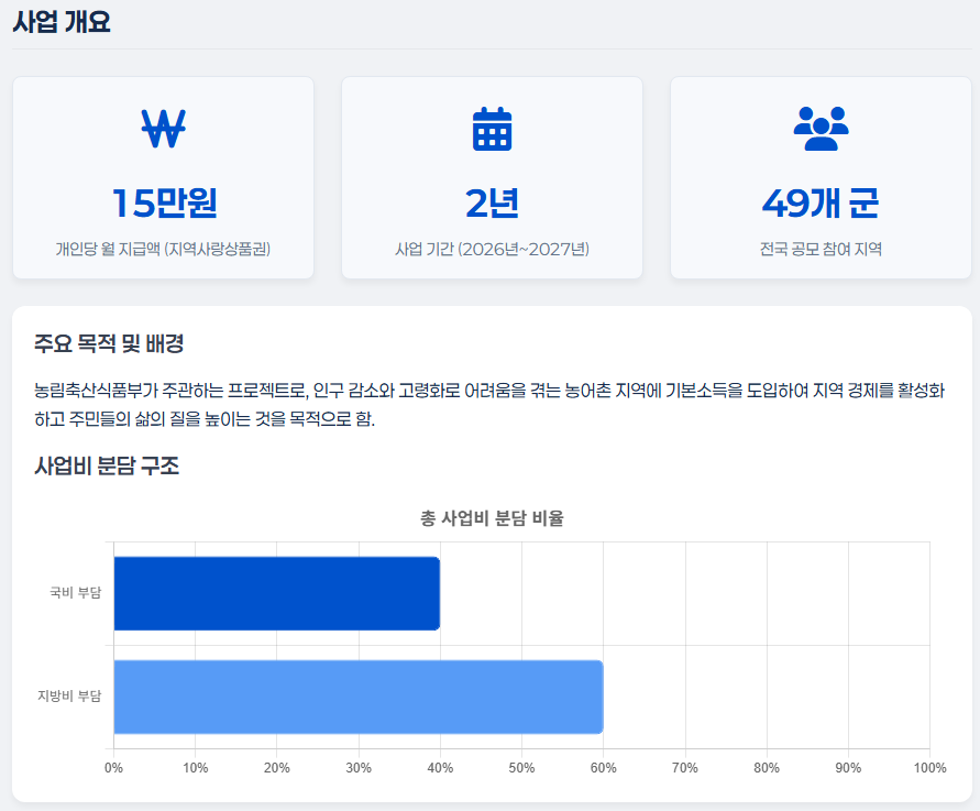 농어촌 기본소득 시범사업은 농림축산식품부가 주관하는 프로젝트로, 인구 감소와 고령화로 어려움을 겪는 농어촌 지역에 기본소득을 도입해 지역 경제를 활성화하고 주민들의 삶의 질을 높이는 것을 목적으로 합니다. 사업 기간은 2026년부터 2027년까지 2년간이며, 지원 금액은 개인당 월 15만원 상당의 지역사랑상품권으로 지급됩니다. 이 상품권은 해당 지역 내에서만 사용할 수 있어 지역 상권 활성화에 기여할 것으로 기대됩니다. 총 사업비는 국비 40%, 지방비 60%로 부담하며, 전국 49개 군이 공모에 참여해 치열한 경쟁을 벌였습니다.