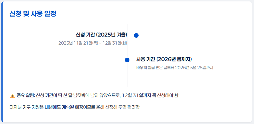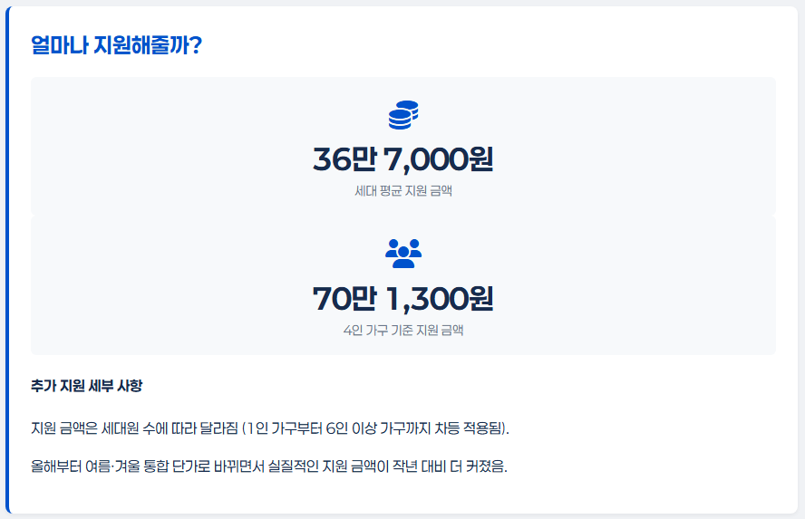 작년까지는 여름바우처와 겨울바우처를 따로 줬는데, 올해부터는 여름·겨울 통합 단가로 바꿔서 실질적으로 지원 금액이 더 커졌다고 하네요!