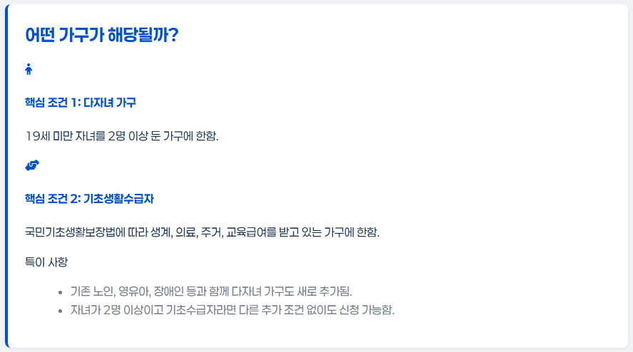 즉, 자녀가 2명 이상이고 기초수급자라면 다른 조건 없이도 신청 가능하다는 뜻입니다.