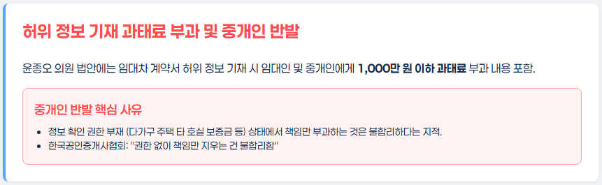 윤종오 의원 법안에는 임대차 계약서에 사실과 다른 정보를 적으면 임대인과 중개인(공인중개사)에게 1000만원 이하 과태료를 부과하는 내용도 있어요. 예를 들어, 보증금이나 주택 상태를 속이면 벌금을 물어요.