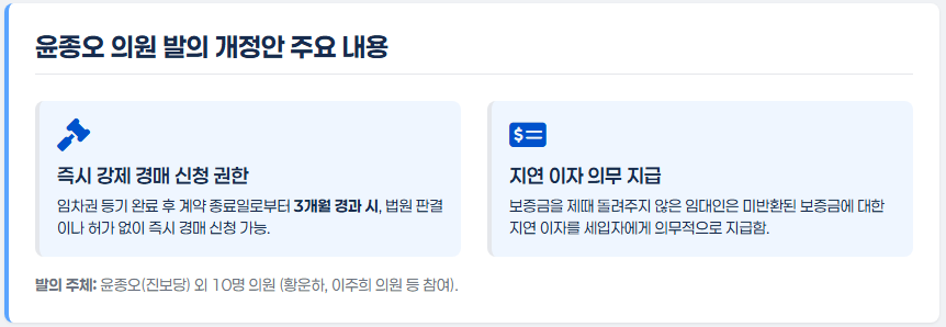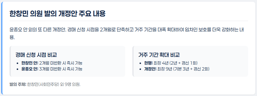 윤종오 의원 법안 외에도 비슷한 내용이 있어요. 지난달 2일, 한창민 사회민주당 대표 등 10명이 발의한 개정안은 계약 종료 후 2개월 이내에 보증금을 돌려주지 않으면 세입자가 바로 경매 신청할 수 있게 해요. 더 나아가, 기본 전월세 계약 기간을 현재 2년에서 3년으로 늘리고, 계약 갱신 청구권(계약 연장 권리) 사용 횟수를 1회에서 2회로 늘려요.