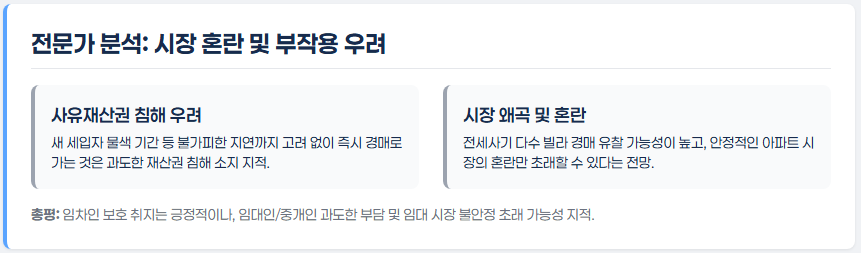 전체적으로 세입자 보호 의도는 좋지만, 임대인과 중개인에게 과도한 부담을 주고 시장 왜곡을 초래할 수 있다는 의견이에요. 고의가 아닌 지연까지 경매로 이어지면 임대 시장이 불안정해질 수 있어요.