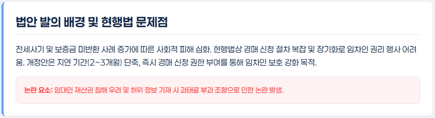 주요 포인트는 보증금 반환 지연이 2~3개월만 돼도 세입자가 바로 경매 신청을 할 수 있게 하는 거예요. 이건 세입자 보호를 위한 조치지만, 임대인 입장에서는 갑작스러운 경매로 인해 재산권이 침해될 수 있다는 우려도 나오고 있어요. 게다가 임대차 계약서에 잘못된 정보를 적으면 임대인과 중개인에게 과태료를 부과하는 내용도 포함돼 논란이 되고 있어요.