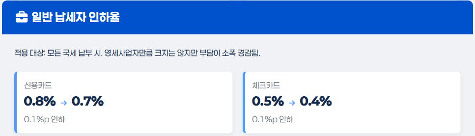 먼저, 영세사업자분들을 위한 인하가 제일 크게 적용돼요. 여기서는 부가가치세와 종합소득세를 카드로 납부할 때 해당돼요. 구체적으로는 다음과 같아요.