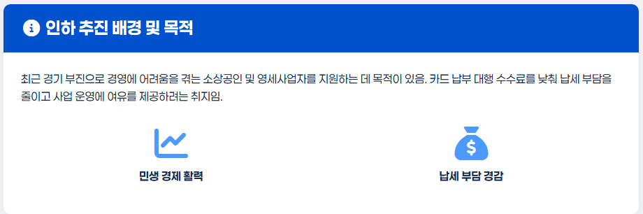 국세청은 민생경제를 지원하기 위해 이 조치를 마련했어요. 최근 경기 부진으로 인해 경영이 힘든 소상공인과 영세사업자들을 돕기 위한 거예요. 국세를 카드로 납부할 때 발생하는 대행 수수료를 낮춰서, 세금을 내는 부담을 조금이라도 줄여주려는 취지죠. 세금을 내는 게 더 수월해지면 사업 운영에 여유가 생길 수 있겠네요.