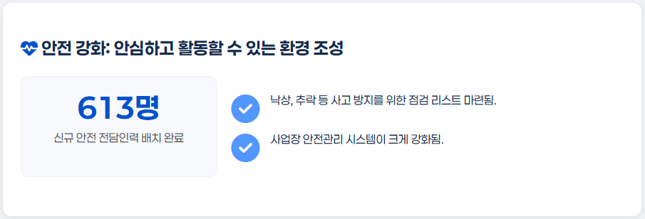 올해는 사업장에 안전 전담인력 613명을 새로 배치하고, 낙상·추락 같은 사고를 막기 위한 점검 리스트도 만들어서 안전관리를 크게 강화한다고 합니다.